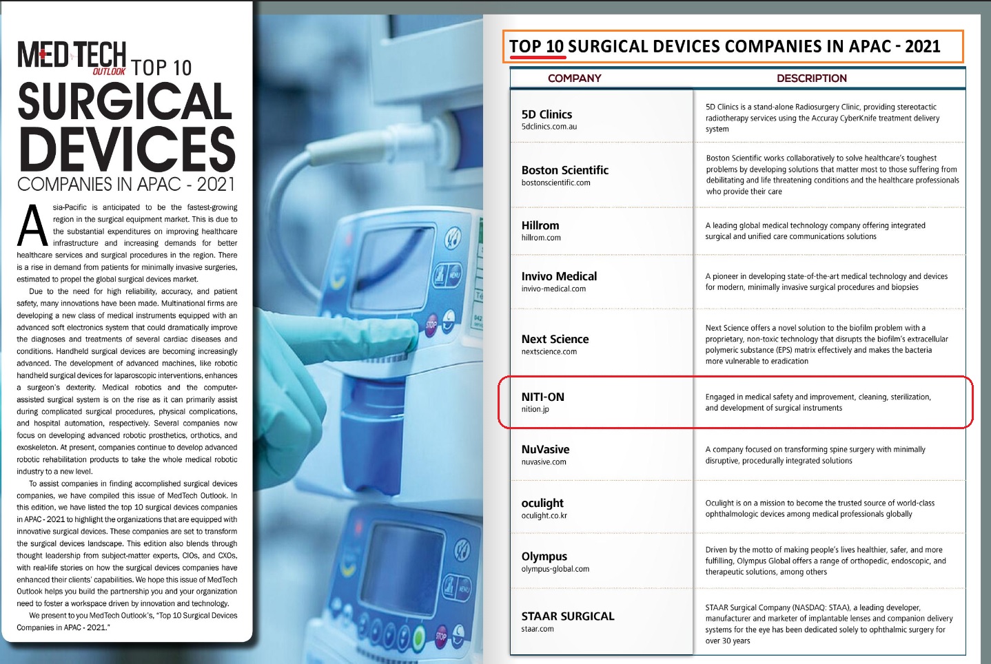 『国際医療誌「MED TECH Outlook APAC」にて、アジア・パシフィックエリアにおけるサージカルデバイス部門のトップ10としてNITIONが取り上げられました。