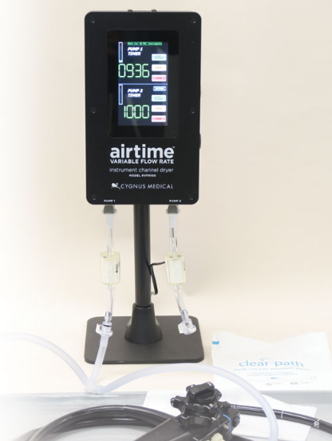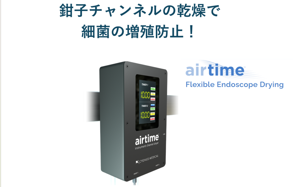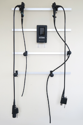 内視鏡鉗子チャンネルドライヤーAIRTIMEは本体に2つの送風ポンプを内蔵。100Vの電源によって2本のスコープを同時に別々に乾燥できる、コンパクトな鉗子チャンネル乾燥器です。