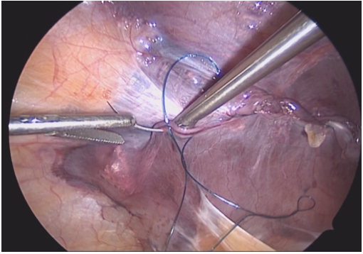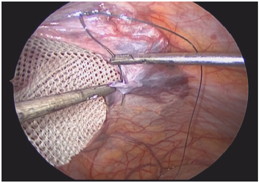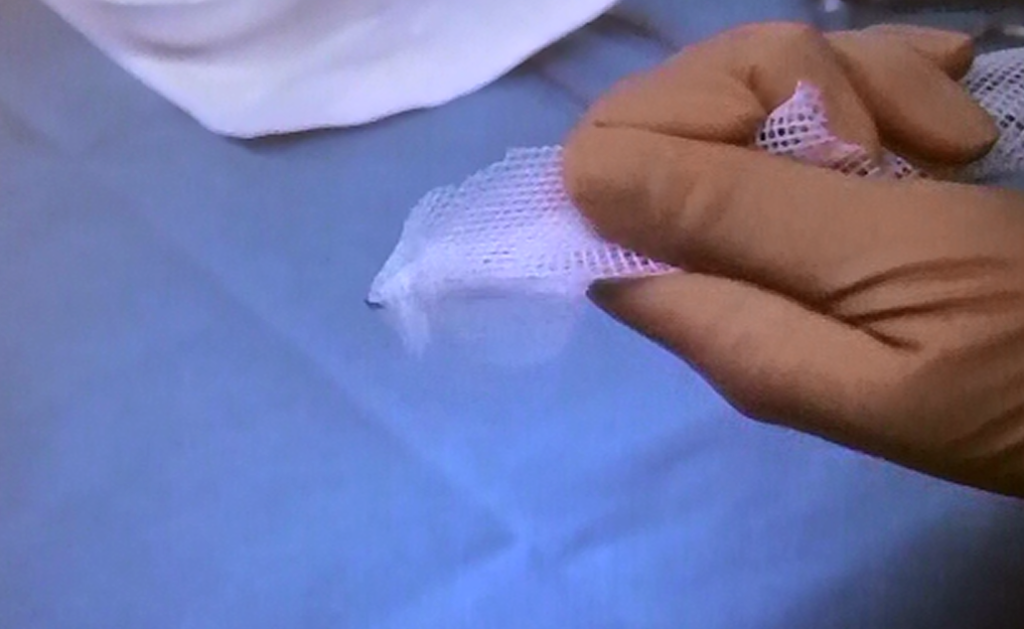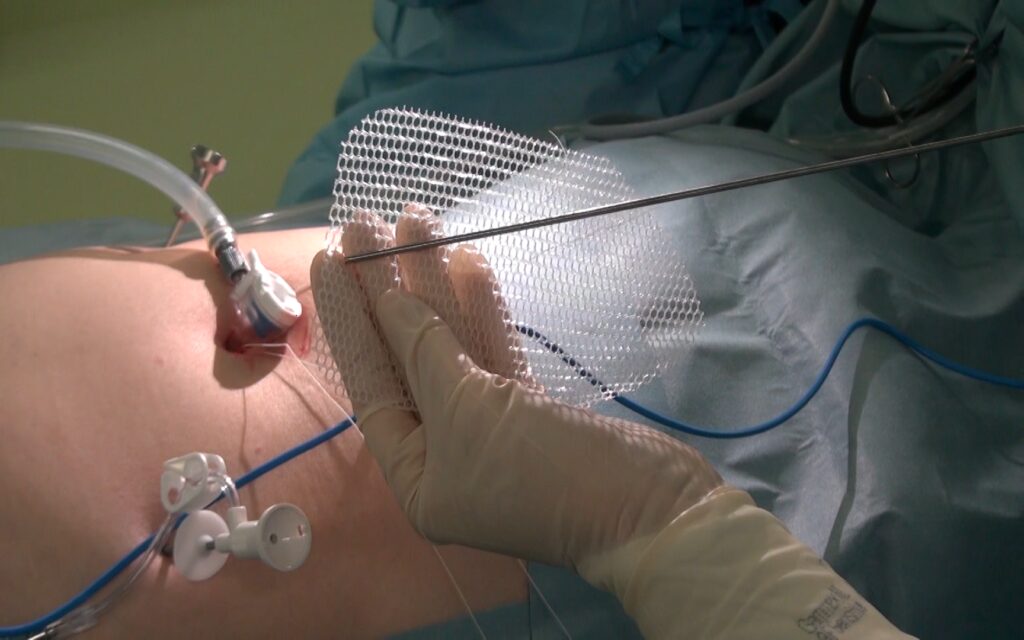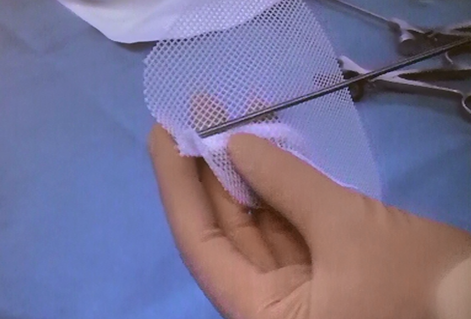 内視鏡下ヘルニア手術において、メッシュ状の補強材をトロかロールを通して、容易に腹腔内に挿入することができます。